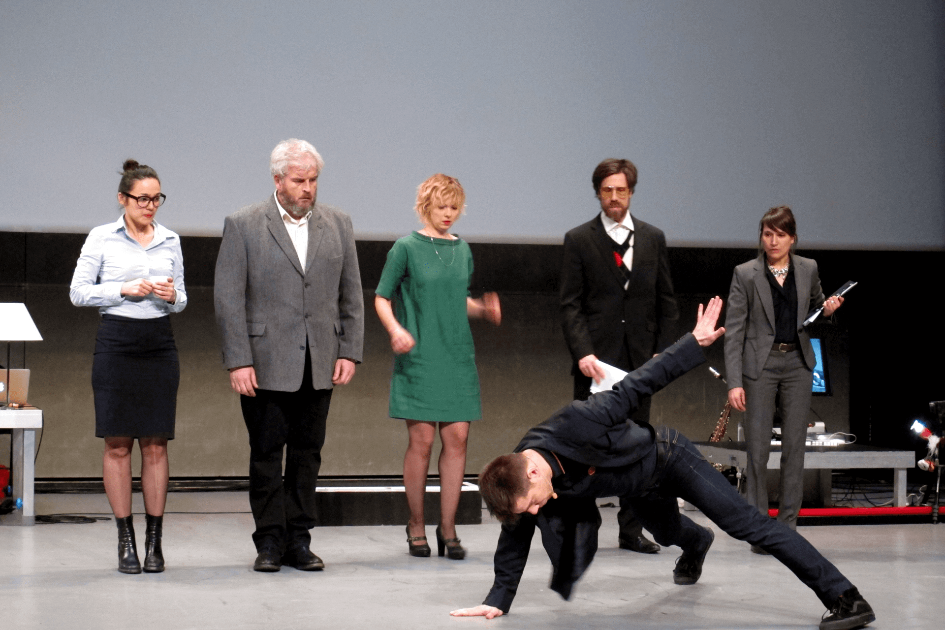 Le nom “Les blouses bleues” fait référence au metteur en scène russe Meyerhold – l’un des premiers à intégrer l’image vidéo sur le plateau, et à développer le travail sur le corps de l’acteur.